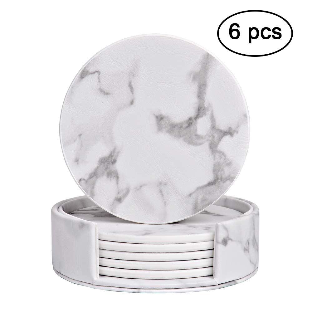 Title : WAYIFON 6 PCS Premium PU Leather Coasters for Drinks with Holder, Heat Resistant Drink Coaster - Protect Furniture from Stains Water Rings and Damage, Mothers' Day Housewarming Gift - Marble White